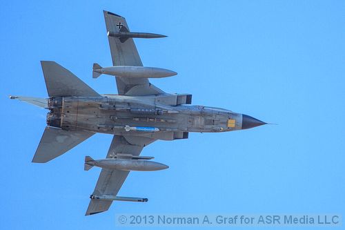 More than 300 German Air Force and Royal Canadian Air Force Airmen and nearly 300 visiting U.S. Sailors, Soldiers and Marines spent three weeks in the high desert of Idaho participating in a combined-joint exercise called Mountain Roundup 2013. This year marks the ninth time Mountain Home AFB has hosted this training exercise which features a broad spectrum of simulated missions. Access to over 7,500 square miles of modern, well-instrumented operational range space allows for realistic training while providing the flexibility to accommodate the complexity of this multinational, multiservice exercise. The exercise is part of the German Air Force (GAF) Tornado Fighter Weapons Instructor Course (FWIC) Mission Employment (ME) Phase and serves as the capstone of a multi-year curriculum. Earlier phases of instruction take place at Holloman AFB, NM, where German aviators typically spend seven months in FWIC training before they participate in Mountain Roundup to finalize their course. Evolving out of previous ME exercises at Nellis AFB, Mountain Roundup combines the best aspects of both Red Flag and Green Flag and features multiple air-to-air and air-to-ground missions such as basic fighter maneuvers, close-air support (CAS), urban combat support, suppression and destruction of enemy air defenses (SEAD/DEAD), and combat search and rescue (CSAR). Per the GAF: “According to its motto ''Sola Praecisio Valet'' (‘Only precision counts’) the FWIC trains highly skilled tactical leaders for the operational Tornado squadrons in Germany, who are able to solve unknown and complex problems with innovation and ingenuity, while teaching their peers how to apply the resulting solutions effectively and safely. This is achieved via a building block approach, starting with academic surface and aerial attack sorties, progressing into tactical missions, fighting surface and dissimilar air threats, while employing a wide range of non-precision, as well as laser guided live weapons.”