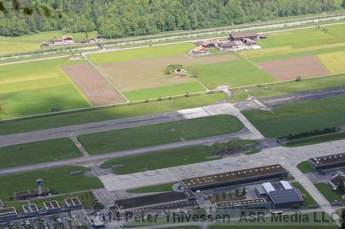 The runway in Meiringen is from east to west and follows the contours of the valley. The taxiways are quite unusual, one of them that routes aircraft to and from the cavern on the south side, crosses a public road. |