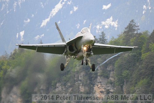 | An essential part of the exercise in Meiringen was the relocation exercise REVITA 2014 from May 13. -15, 2014. Four Hornets and four Tigers were moved from Meiringen Air Base to the airbase of Buochs, a “standby nonpermanent airbase”. To see if the the airforce is able to move during crisis quickly all the materials required for this non permanent and only minimally equipped airfield, in order that the flight operations can be performed without restrictions. Due to the bad weather, only 56 movements were carried from the 82 planned. Nevertheless, the exercise leader was “very satisfied” with the results according to Colonel, Peter Merz, Air Base Commander Meiringen of the Swiss Airforce. |